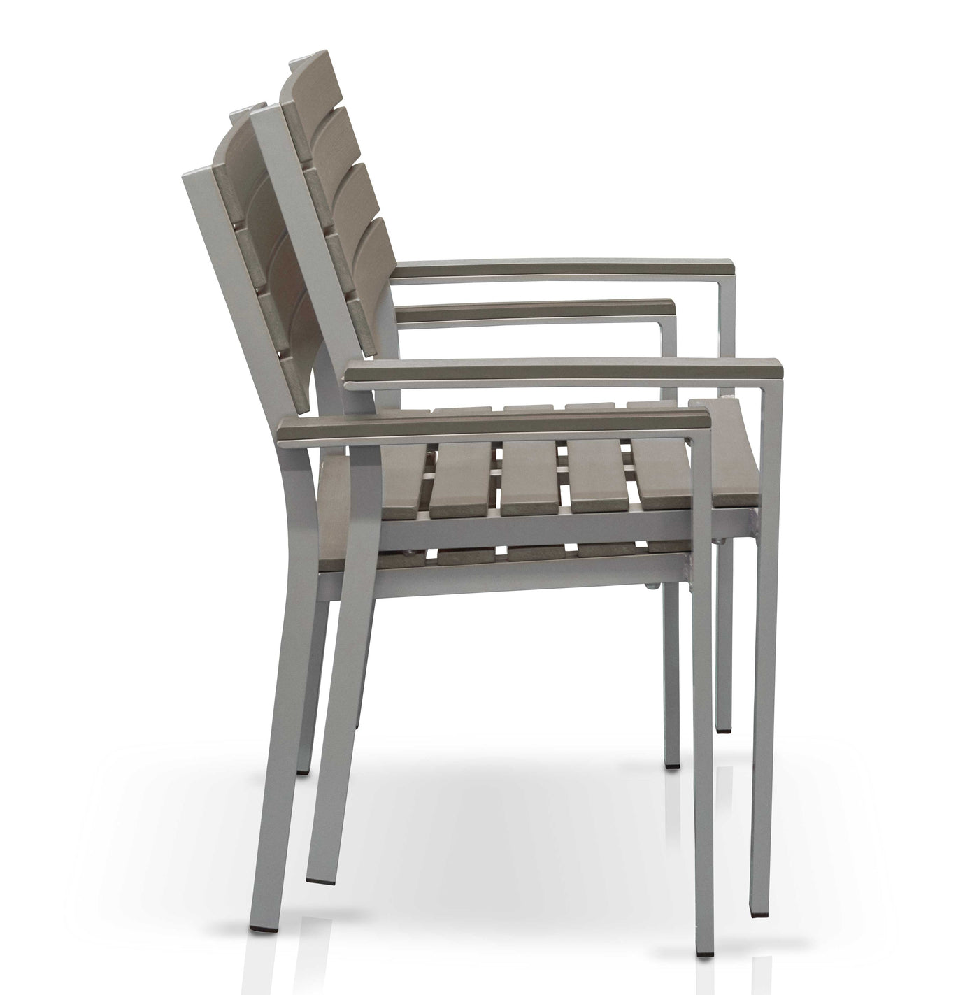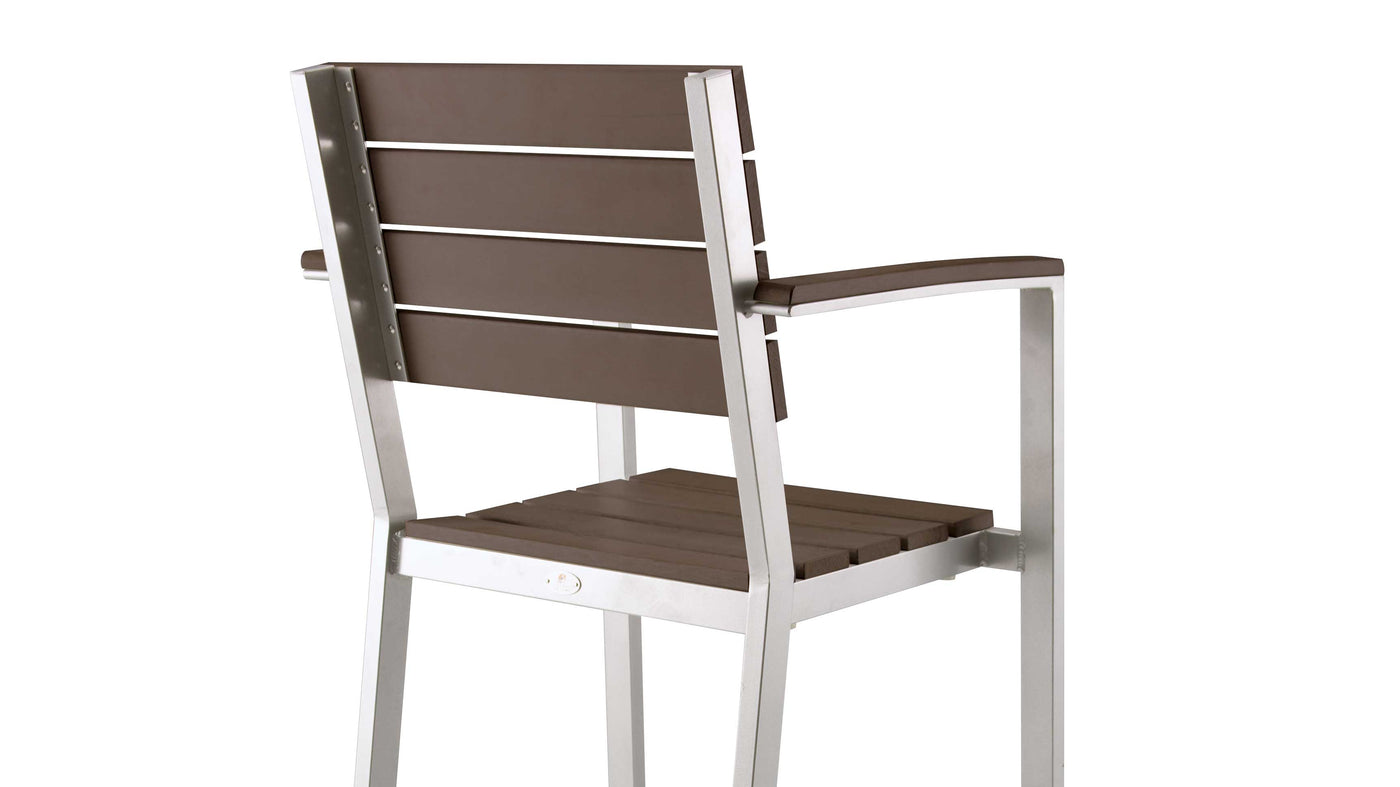 The plastic lumber is UV resistant to keep its color over time. Their aluminum frames make them easy to move where they are needed, and the chairs are stackable for ease of storage.