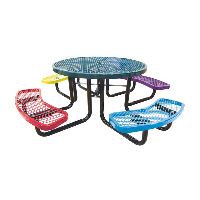 This round, perforated 46 ̋ round table is sized especially for children. The table height is 24 1⁄2 ̋ tall and the seat height is 11 7⁄8 ̋ tall. Multiple thermo-plastic colors give the table a festive look.